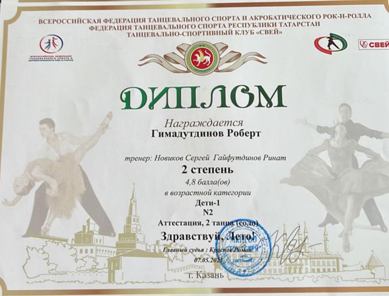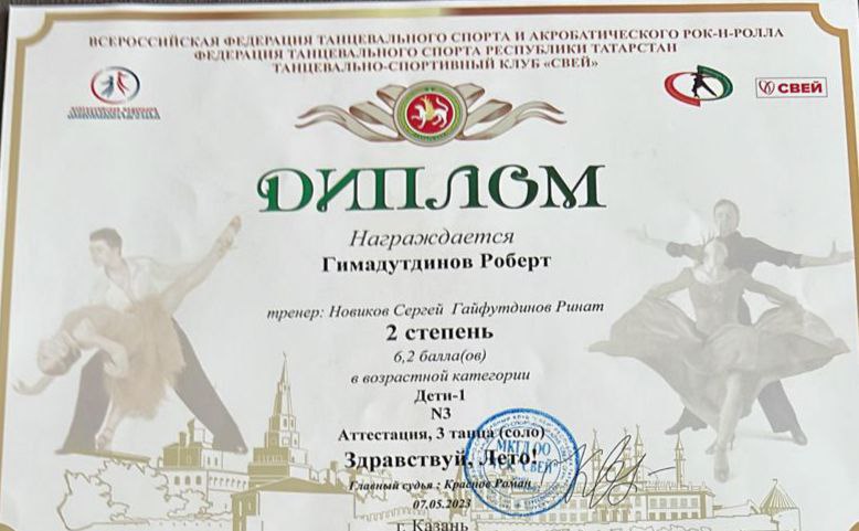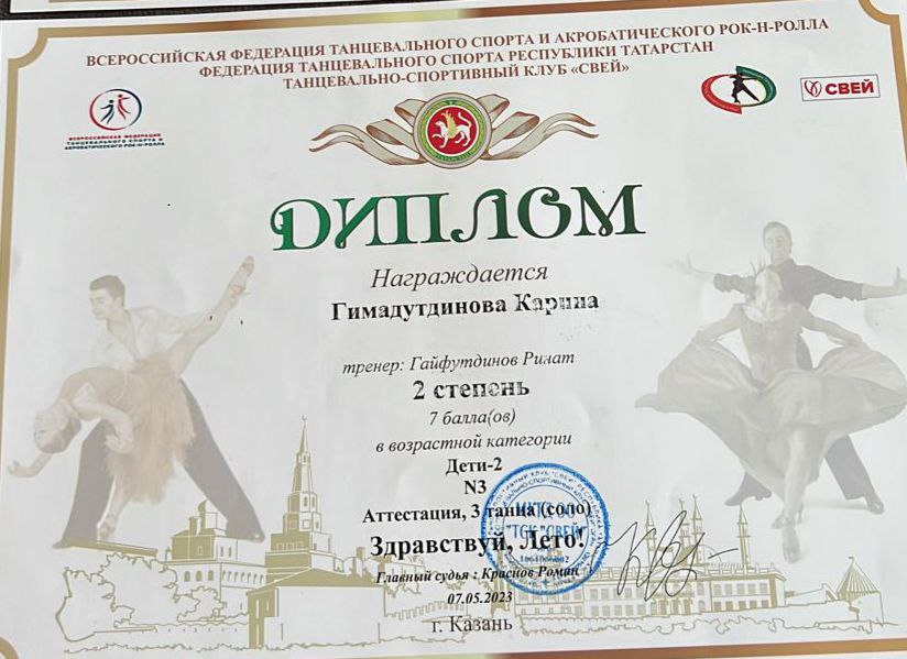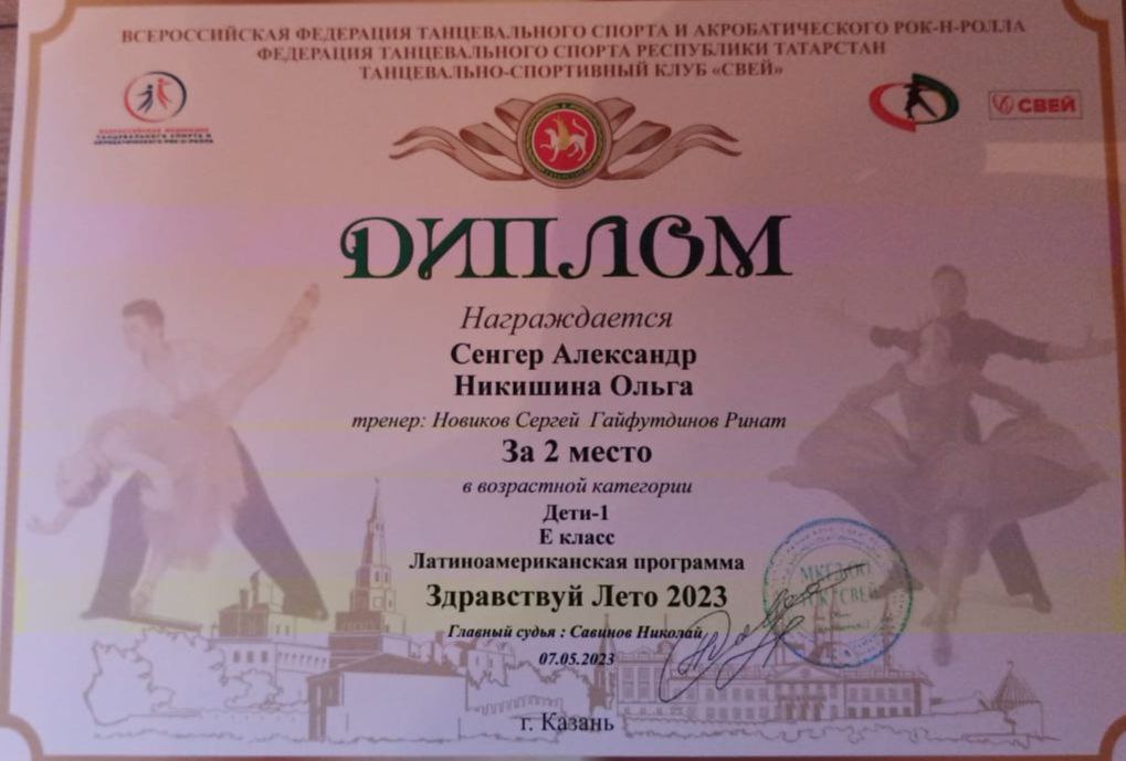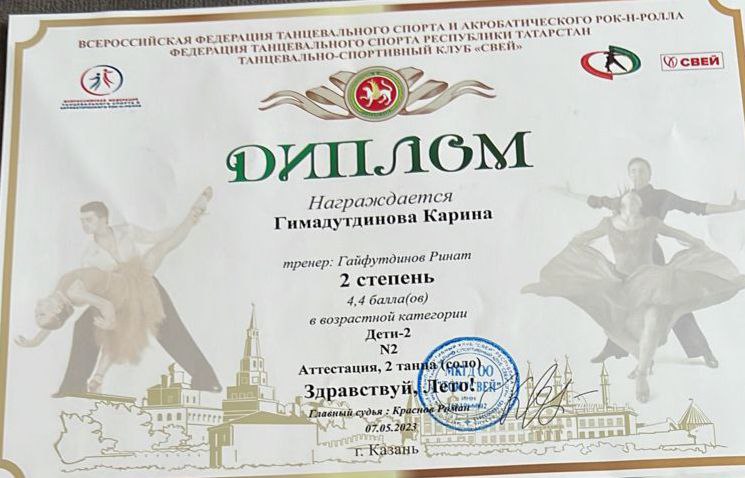 Опубликовано: 10.05.2023Поздравляем победителей Всероссийских соревнований по спортивно-бальным танцам "Здравствуй, лето!" объединения "Свей" (педагог Гайфутдинов Р.Н.)