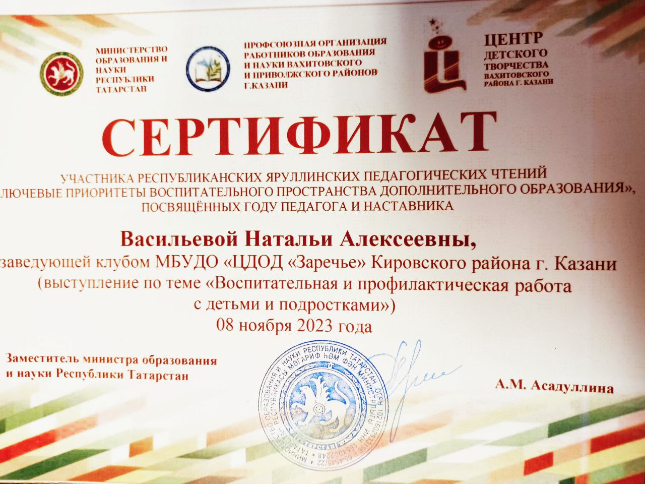 Опубликовано: 08.11.20238 ноября в Центре детского творчества Вахитовского района г. Казани прошли Республиканские Яруллинские педагогические чтения «Ключевые приоритеты воспитательного пространства дополнительного образования», посвященные году педагога и наставника. В мероприятии приняла участие заведующая клубом Полёт Васильева Наталья Алексеевна, она выступила в одной из секций с докладом «Воспитательная и профилактическая работа с детьми и подростками».