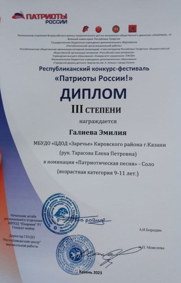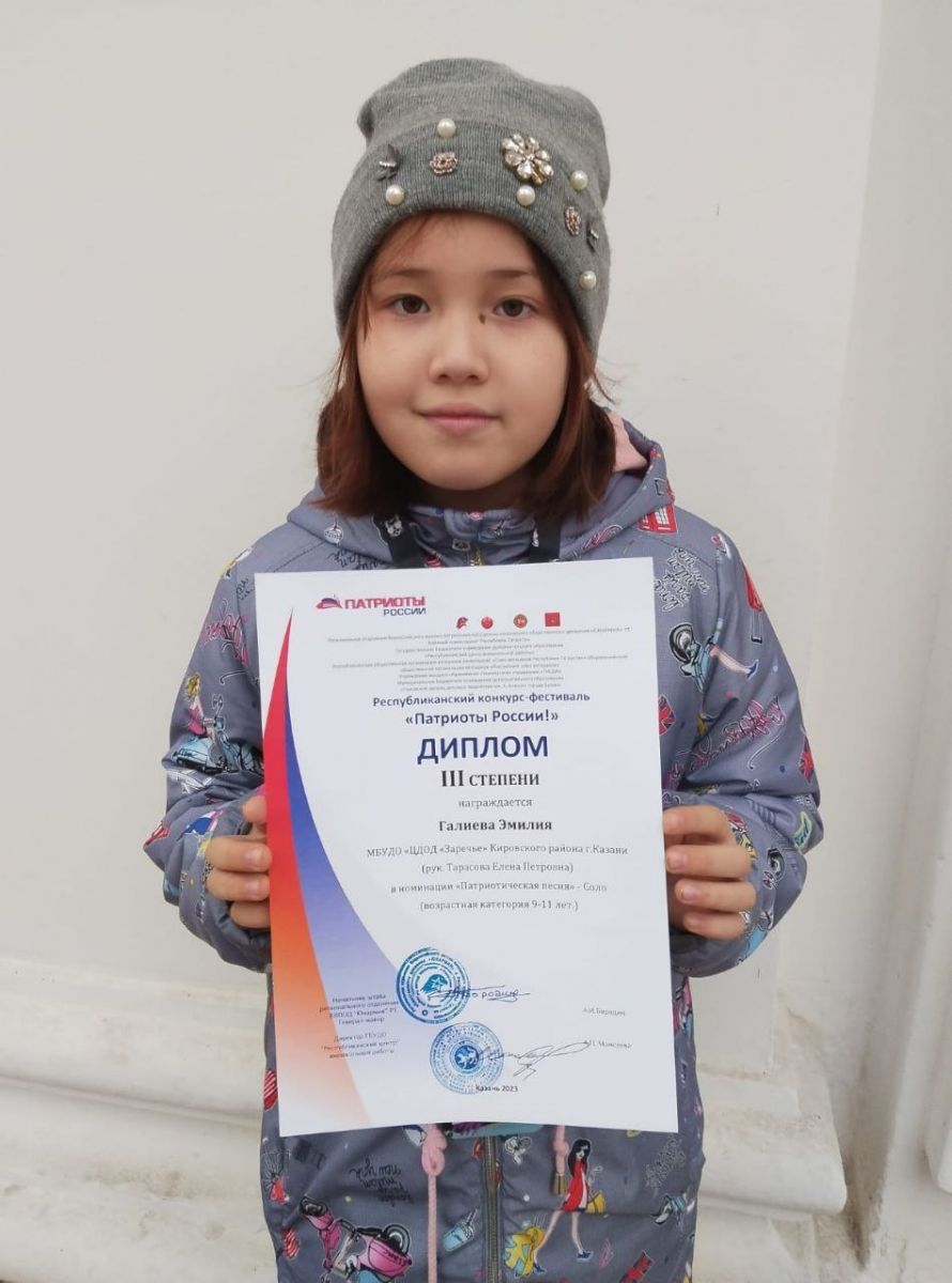 Опубликовано: 09.11.2023Поздравляем солистку вокальной студии "Исток" Галиеву Эмилию с почётным 3 местом Республиканского конкурса "Патриоты России". Желаем дальнейших творческих успехов и побед!