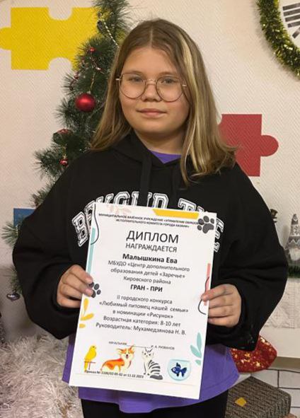 Опубликовано: 22.12.2023Поздравляем Малышкину Еву, учащуюся объединения "Правополушарное рисование" с Победой! ГРАН-ПРИ Городского конкурса "Любимый питомец нашей семьи".