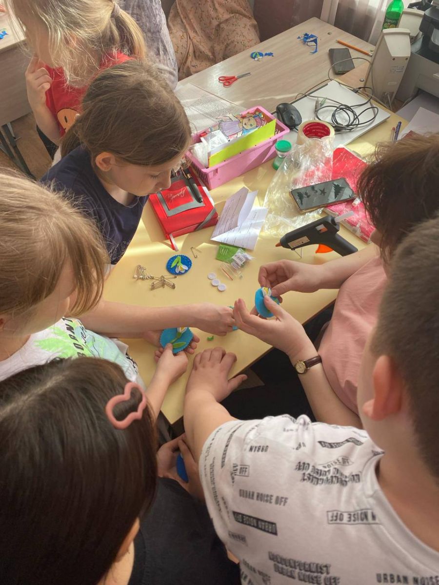 В знак единения и поддержки ученики и дошколята прикрепили символические белые крокусы на одежду.