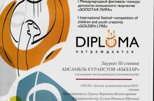 ПОЗДРАВЛЯЕМ БАГАПОВУ АЛИЮ - ЛАУРЕАТА III СТЕПЕНИ И АНСАМБЛЬ КУРАИСТОВ "КЫЗЛАР " - ЛАУРЕАТОВ III СТЕПЕНИ МЕЖДУНАРОДНОГО ФЕСТИВАЛЯ - КОНКУРСА "ЗОЛОТАЯ ЛИРА"!!! БЛАГОДАРИМ ПРЕПОДАВАТЕЛЯ - ЛАРИНУ В.В. И КОНЦЕРТМЕЙСТЕРА -ЕЛГИНУ Н.Ю. ЗА ВЫСОКУЮ РЕЗУЛЬТАТИВНОСТЬ!!! ЖЕЛАЕМ ЗДОРОВЬЯ И ВДОХНОВЕНИЯ!!!