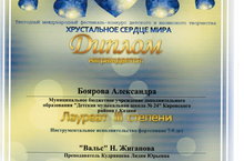 Поздравляем Боярову Александру - Лауреата III степени и Корнееву Варю - Дипломанта I степени Меңдународного конкурса "ХРУСТАЛЬНОЕ СЕРДЦЕ МИРА", класс преподавателя Кудрявцевой Лидии Юрьевны!