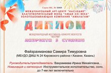 Самира по достоинству стала Лауреатом 2 степени в номинации "Инструментальное исполнительство. Фортепиано." Это прекрасный результат и отличный стимул, чтобы участвовать в новых конкурсах, вновь побеждать и делиться своими успехами.