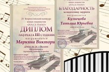 Музаффарова Альфия - Лауреат III степени, Репина Анна - Лауреат II степени. Благодарим преподавателя Плешаковук Розу Фависовну и концертмейстера Сафину Альбину Харисовну за подготовку, труд и большой вклад в развитие наших детей.