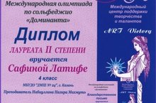 Поздравляем Сафину Латифу и преподавателя Набиуллину Назиру Махмутовну с отличным результатом - Лауреат II степени в Международной Олимпиаде по сольфеджио "ДОМИНАНТА". Умница! Так держать!