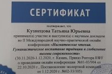 Ещё одно важное участие во II Международной научно-практической онлайн конференции под названием "Нигматовские чтения. Гуманистическое воспитание традиции и глобальные вызовы современности", организованная Казанским Федеральным Университетом. С научным докладом выступила преподаватель ДМШ № 24 Кузнецова Татьяна Юрьевна