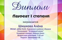 В этом же конкурсе приняла участие и удостоилась Лауреата III степени в номинации "Эстрадный вокал" Шишкова Алёна, преподаватель Звонарева Л.В.