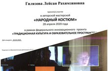 В рамках федерального инновационного проекта «Традиционная культура и образовательное пространство» в дистанционной онлайн платформе ИРО РТ прошла авторская мастерская «Народный костюм», где Лейсан Рахимзяновна приняла активное участие. Специалистами по традиционной культуре была подготовлена лекция по народному костюму татар Поволжья и Приуралья и мастер-класс по изготовлению традиционного фартука казанских татар от руководителя казанской мастерской традиционного костюма «ДушуГрея» Юлии Ахметзяновой.