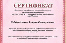 31 октября 2017 года преподаватель фортепиано Сайфутдинова Альфия Самигулловна приняла участие в работе Всероссийской конференции "Практические аспекты нетрадиционной работы школьного педагога с родителями". Тема выступления: "Сотрудничество педагогов и родителей - залог успешного обучения в музыкальной школе".