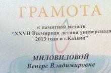 Администрация Детской музыкальной школы № 1 поздравляет преподавателя по классу домры Миловидову Венеру Владимировну с вручением памятной медали "XXVII Всемирная летняя универсиада 2013 года в Казани". Грамоту к памятной медали подписал Президент Российской Федерации В.В. Путин.