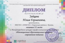 Администрация ДМШ № 1 поздравляет преподавателя по классу фортепиано Зайцеву Юлию Германовну, занявшую 3 место в международном конкурсе профессионального мастерства "Инновационная образовательная практика современного педагога".