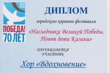 Поздравляем хор "Вдохновение" с вручением Диплома участника Городского хорового фестиваля "Наследники Победы. Поют дети Казани".