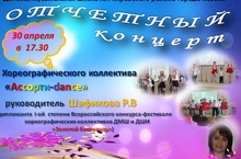 Отчетный концерт "Ассорти-dance" 23.04.2014 Хореографический коллектив "Ассорти-dance" приглашает на Отчетный концерт, который состоится 30 апреля 2014 года. Начало концерта в 17.30.