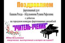 Поздравляем фортепианный дуэт Кашаева Резеда – Абдульминова Рузанна Рафаэлевна с дебютом на городском конкурсе фортепианных ансамблей «УЧИТЕЛЬ – УЧЕНИК»! 08.04.2013