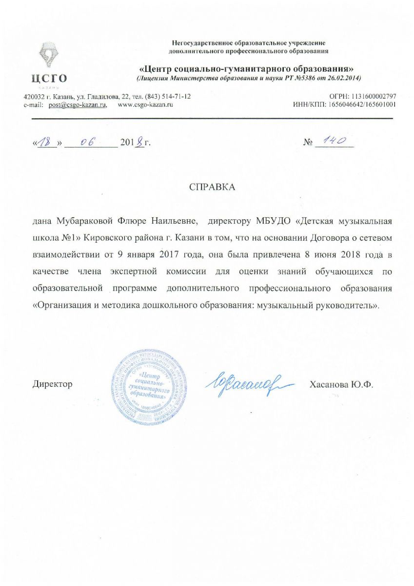 Директор МБУДО "ДМШ № 1" Мубаракова Ф.Н. является членом экспертной комиссии НОУ ДПО "Центр социально-гуманитарного образования".