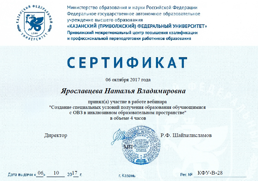 5. заместитель директора по УВР Ярославцева Н.В. - участник вебинара "Реализация адаптированных основных образовательных программ для детей с ОВЗ