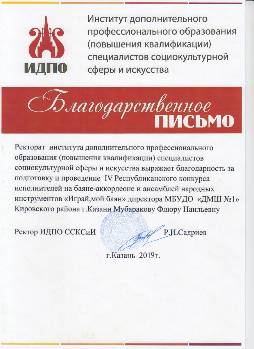 4. МБУДО "ДМШ № 1" Кировского района - организатор IV Республиканского конкурса исполнителей на баяне-аккордеоне и ансамблей народных инструментов "Играй, мой баян". Дата проведения - 14 апреля 2019 г.