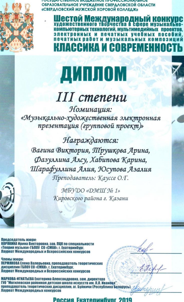 3. VI Международный конкурс художественного творчества в сфере музыкально-компьютерных технологий, мультимедиа проектов "Классика и современность". Проектная работа "Биография А.С. Скрябина", 6 человек