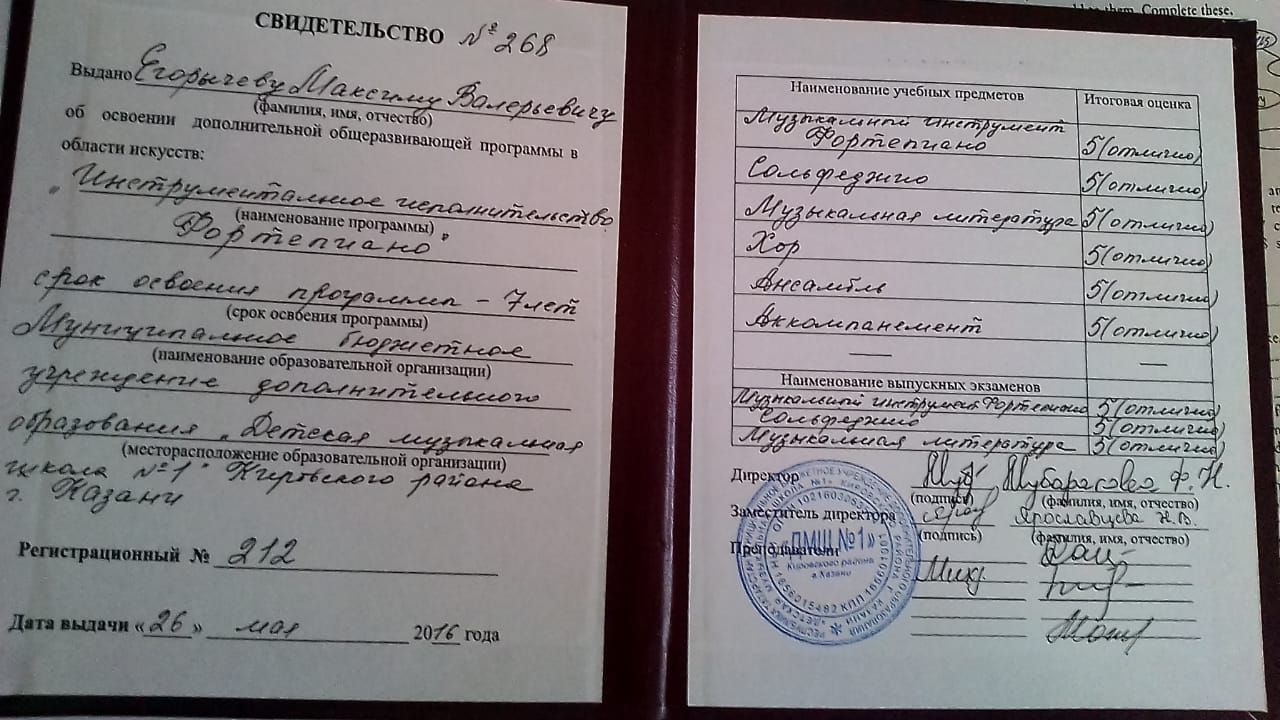 3. В 2018 году выпускник МБУДО "ДМШ № 1" Егорычев Максим поступил в ГАПОУ "Казанский музыкальный колледж им. И.В. Аухадеева"
