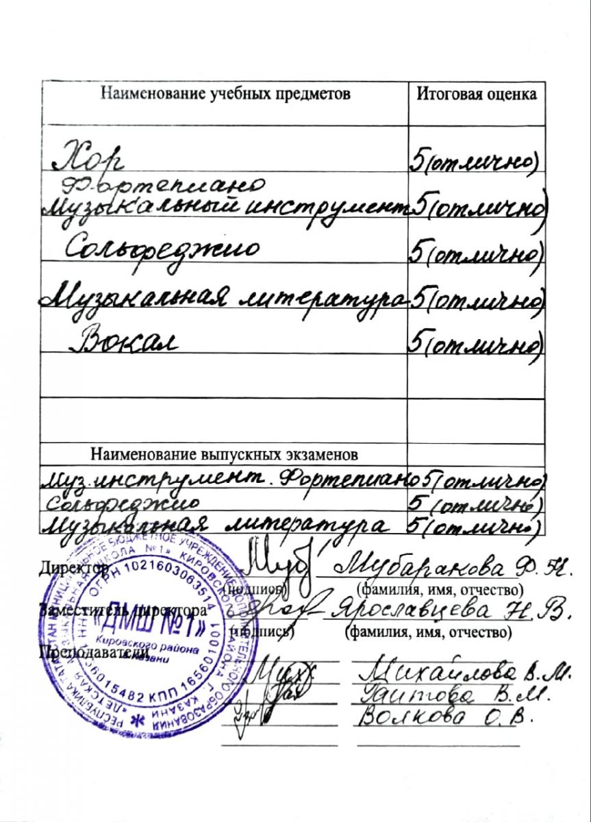Свидетельство об освоении ДОП ОМИ "Инструментальное исполнительство. Фортепиано"