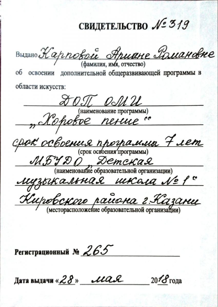 4. В 2018 году выпускница МБУДО "ДМШ № 1" Карпова Ариана поступила на подготовительное отделение ГАПОУ "Казанский музыкальный колледж им. И.В. Аухадеева