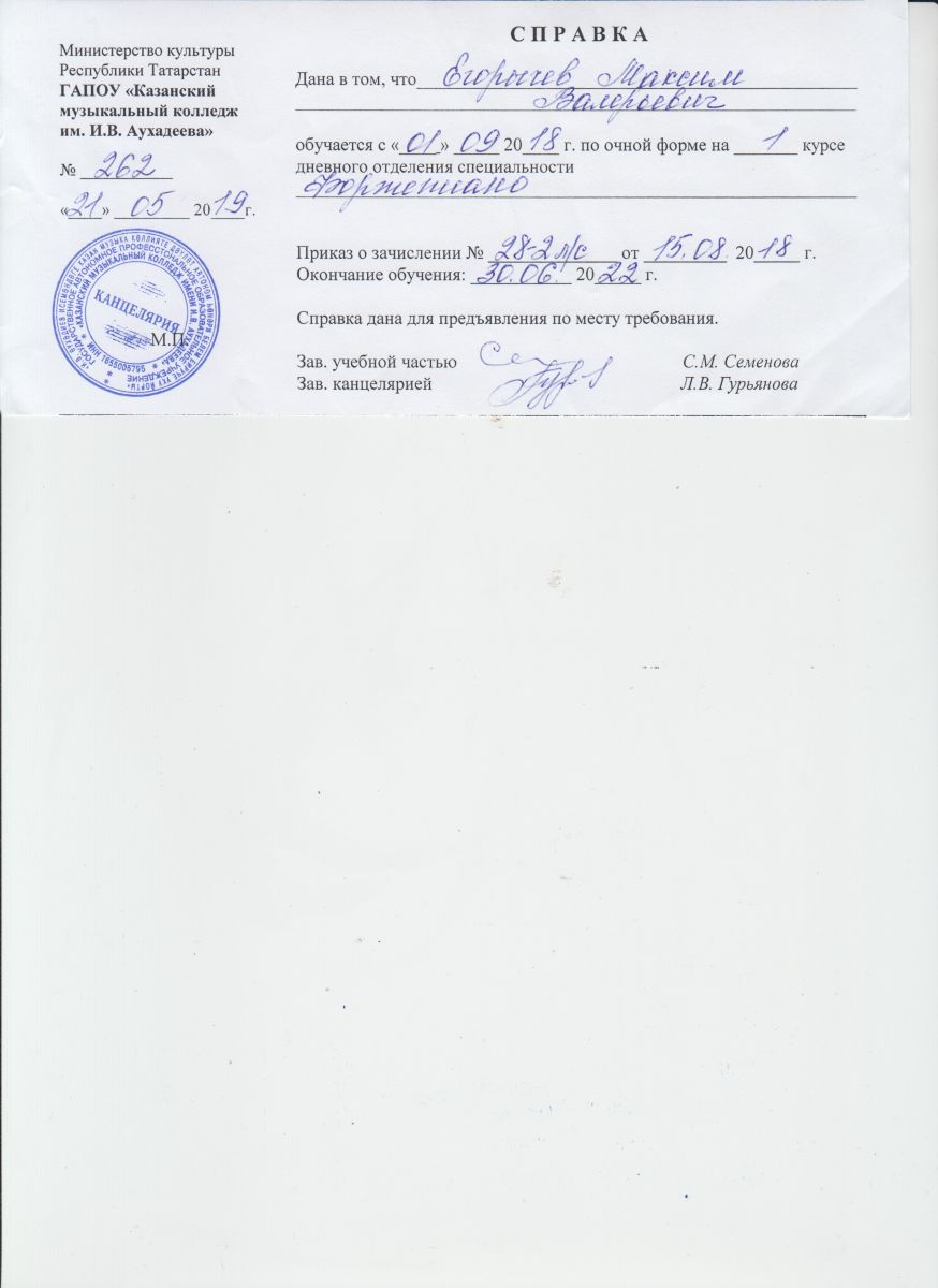 Справка № 262 от 21.05.2019 об обучении на 1 курсе дневного отделения по специальности "фортепиано"