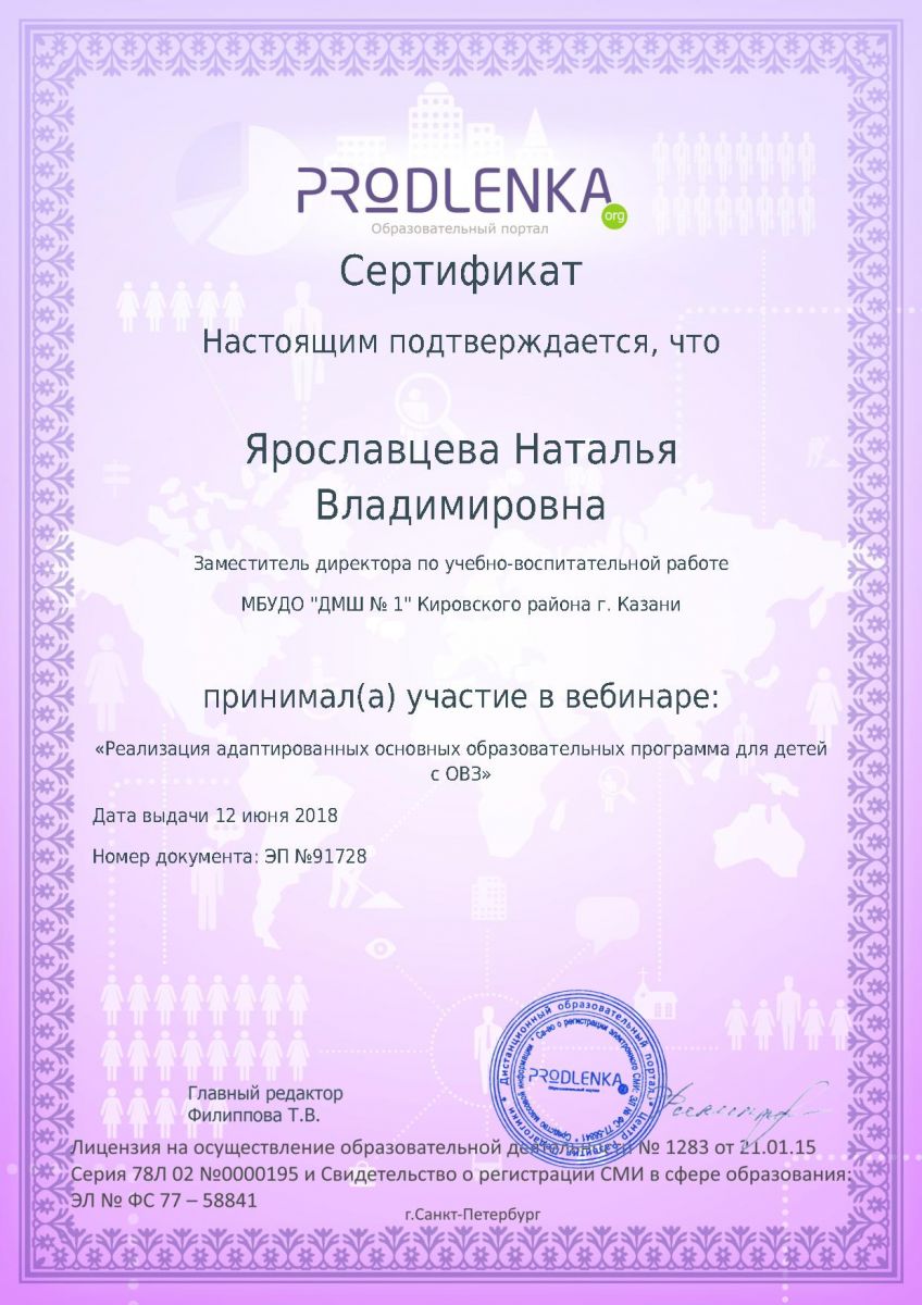 3. Ярославцева Н.В. приняла участие в вебинаре "Реализация адаптированных основных образовательных программ для детей с ОВЗ"