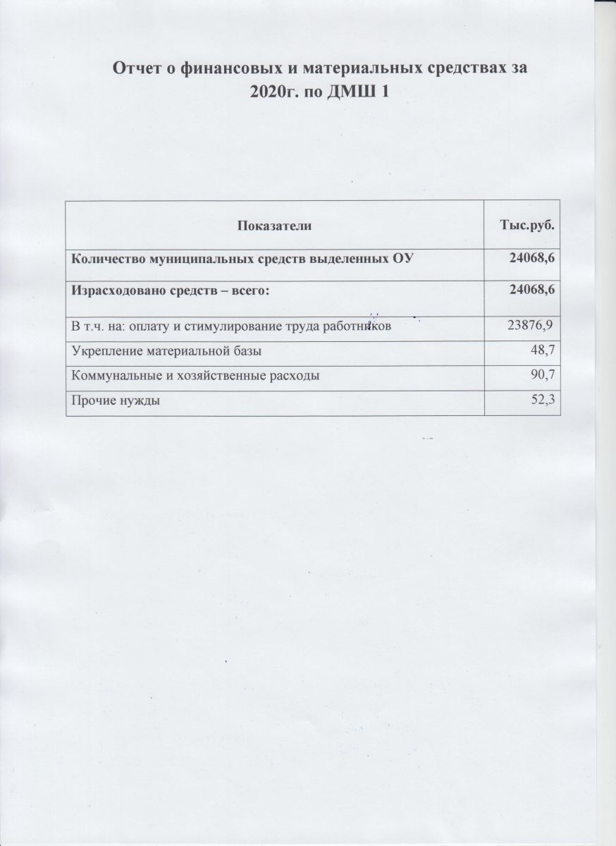 Отчет о привлечении и расходовании внебюджетных средств, поступивших в ДМШ №1 в 2020 году