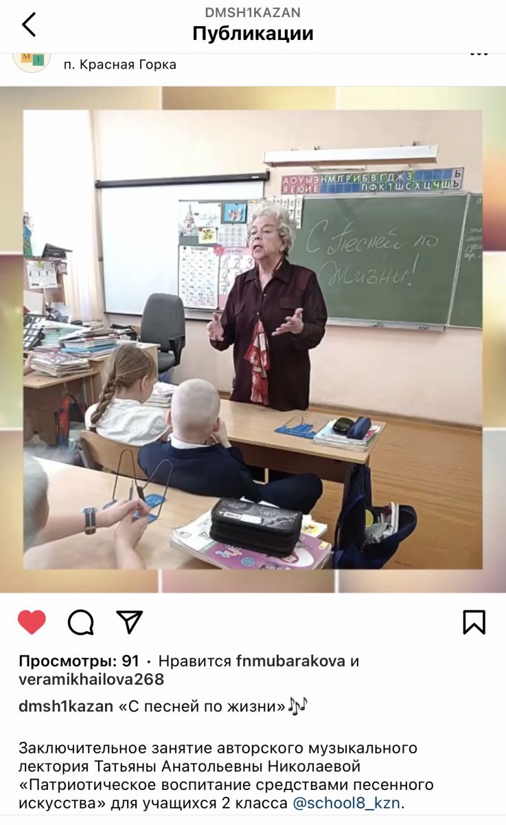 13. Музыкальный лекторий для учащихся 1 класса СОШ № 8 "Патриотическое воспитание средствами песенного искусства". Автор и ведущая - Заслуженный работник культуры РТ Татьяна Анатольевна Николаева.