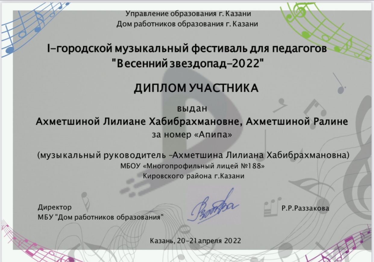 13. Профильная программа Университета талантов "Волшебство народных инструментов" (апрель, 2022). Участник - учащийся 6 класса Камалов Рамиль (балалайка), преп. Ахметшина Л.Х. ФОТО 1 ФОТО 2 ФОТО 3 Сертификат