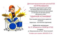 Детская музыкальная школа №18 им.М.Музафарова Объявляет набор на новый 2022-2023 учебный год по предпрофессиональной программе с 5-летним и 8-летним сроком обучения в класс "Ударной установки". Приглашаем мальчиков и девочек от 10 лет (взрослых - на платной отделение). Ждем всех желающих 16,17,18 августа с 10.00 до 17.00