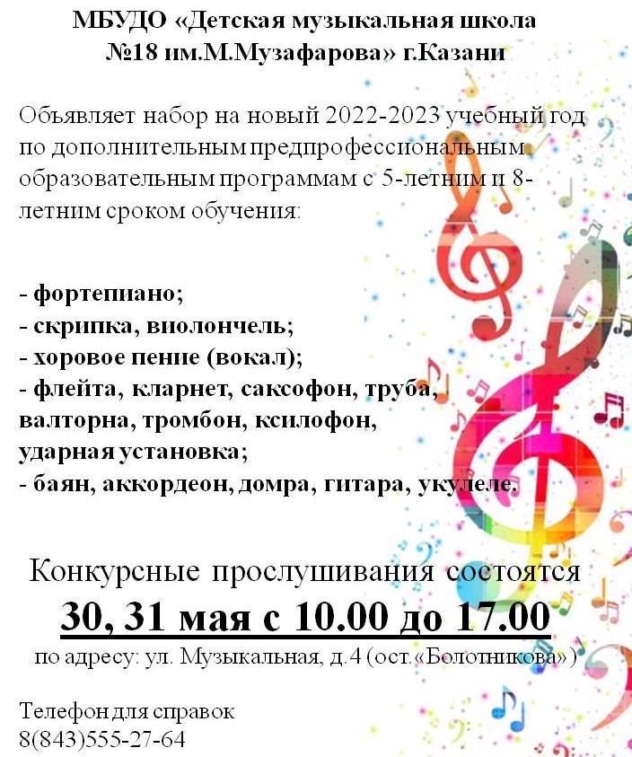 МБУДО г.Казани «Детская музыкальная школа №18 им.М.Музафарова» объявляет набор на новый 2021-2022 учебный год на конкурсной основе по дополнительным предпрофессиональным образовательным программам с 8-летним (5-летним) сроком обучения: