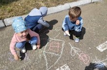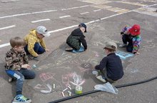 Вооружившись цветными мелками, юные художники с огромным желанием, радостью и восторгом творили свои «шедевры» на асфальте. И вскоре асфальт превратился в мозаику неповторимых образов: солнышко и домик, бабочки и жучки, цветочки и сердечки.