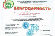 Объявляет БЛАГОДАРНОСТЬ коллективу МАДОУ "ЦРР - ДЕТСКИЙ САД №88" за плодотворную систематическую работу по профилактике детского дорожно - транспортного травматизма и активное участие в республиканском смотре - конкурсе "Зеленый огонек"