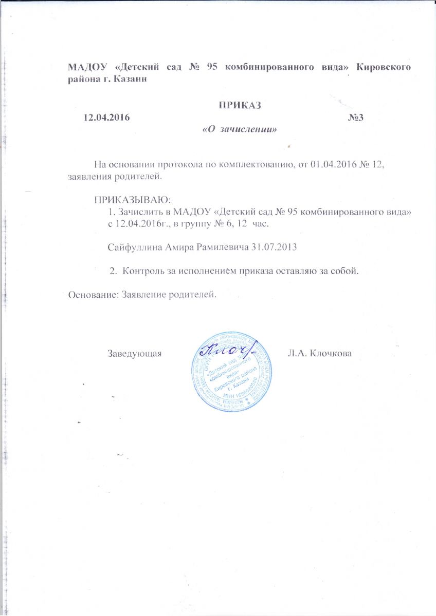Распорядительный акт о зачислении ребенка в образовательную организацию