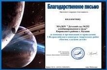 Поздравляем педагогический коллектив МАДОУ "Детский сад №252" получивший Благодарность за помощь в организации и проведении I Всероссийского конкурса творческих работ "Космос глазами детьми". Молодцы!!!