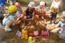 Юные строители создавали из песка городок. Дети старались, учились работать с мокрым и влажным песком. Воспитатели поддерживали интерес воспитанников идеями, украшали песочную композицию природным материалом и увлеченно совместно с детьми создавали "Фантастический городок"!!! Удовольствие и радость от совместной деятельности получили все.