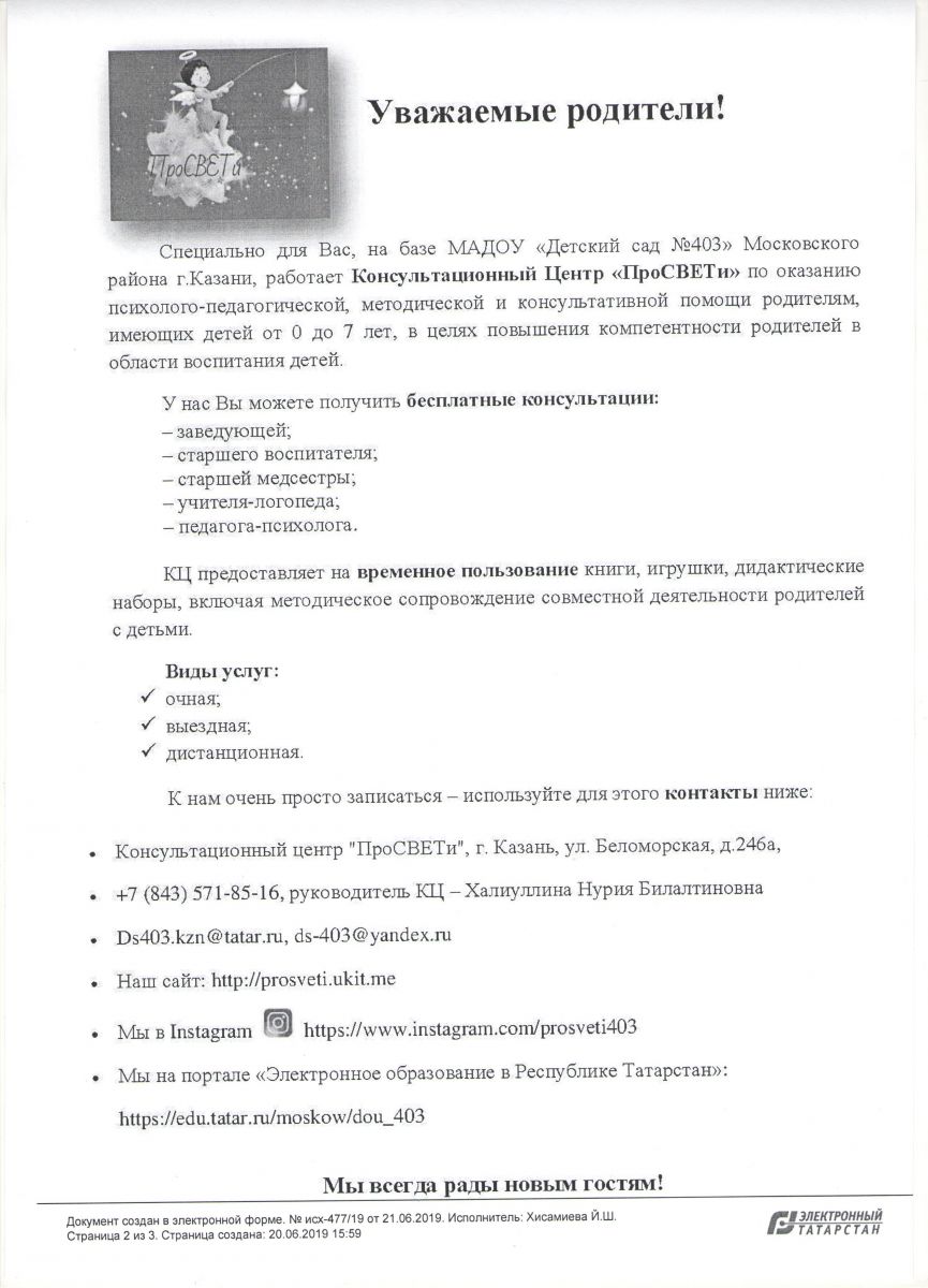 Специально для Вас, на базе "Детский сад №403" Московского района г. Казани, работает Консультационный Центр "ПроСВЕТи"
