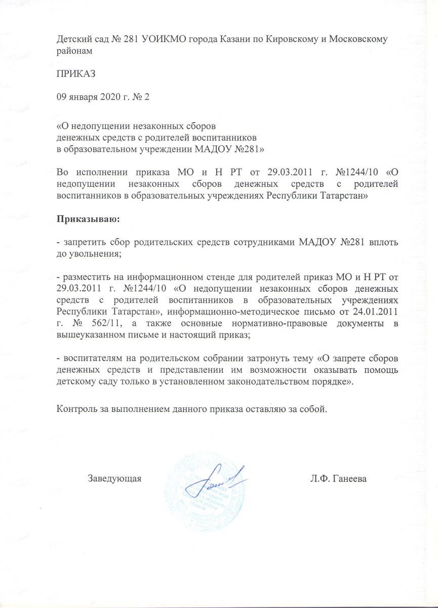 Приказ о недопущении незаконных сборов денежных средств