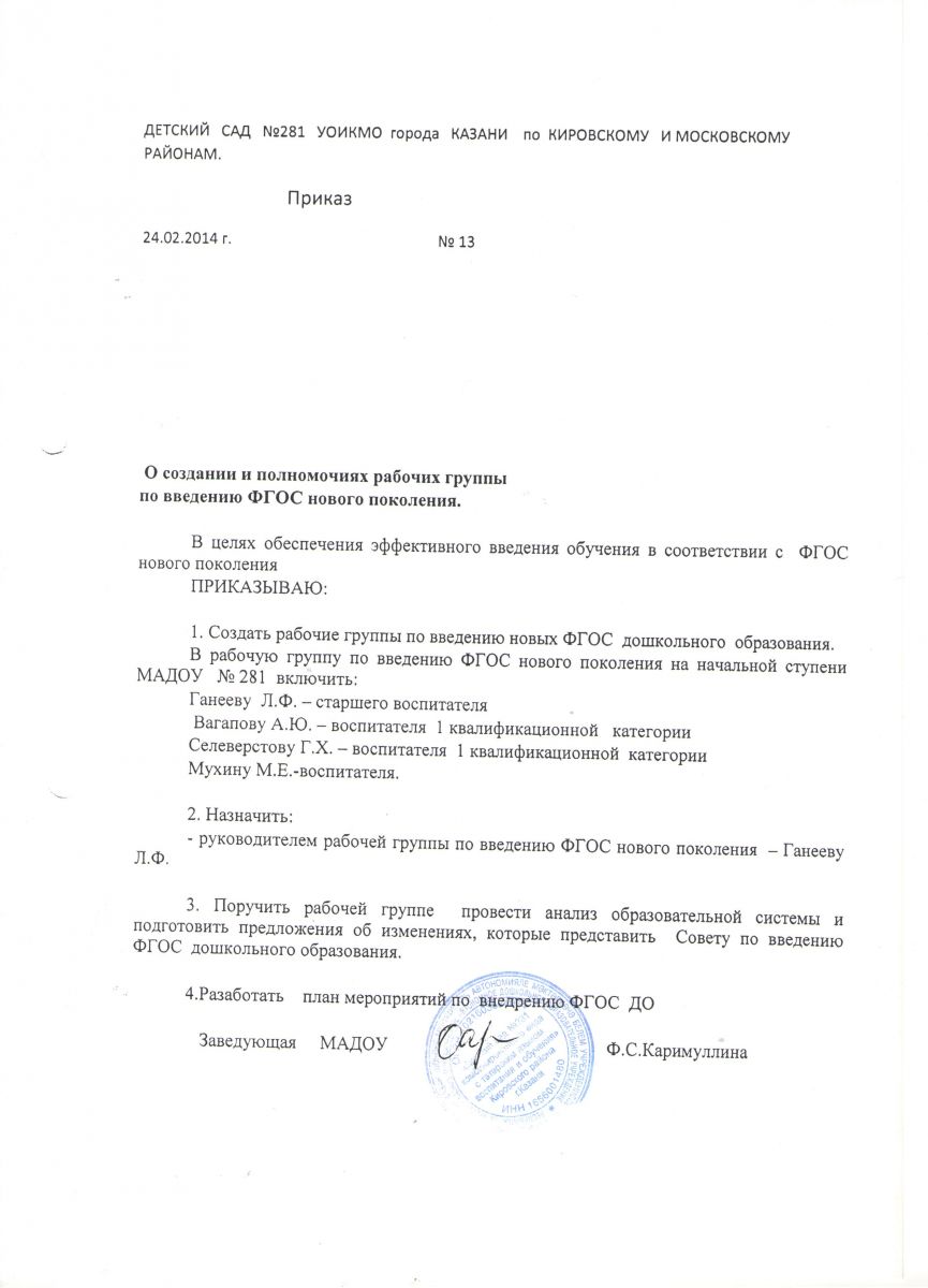 Приказ о создании рабочей группы по внедрению ФГОС ДО