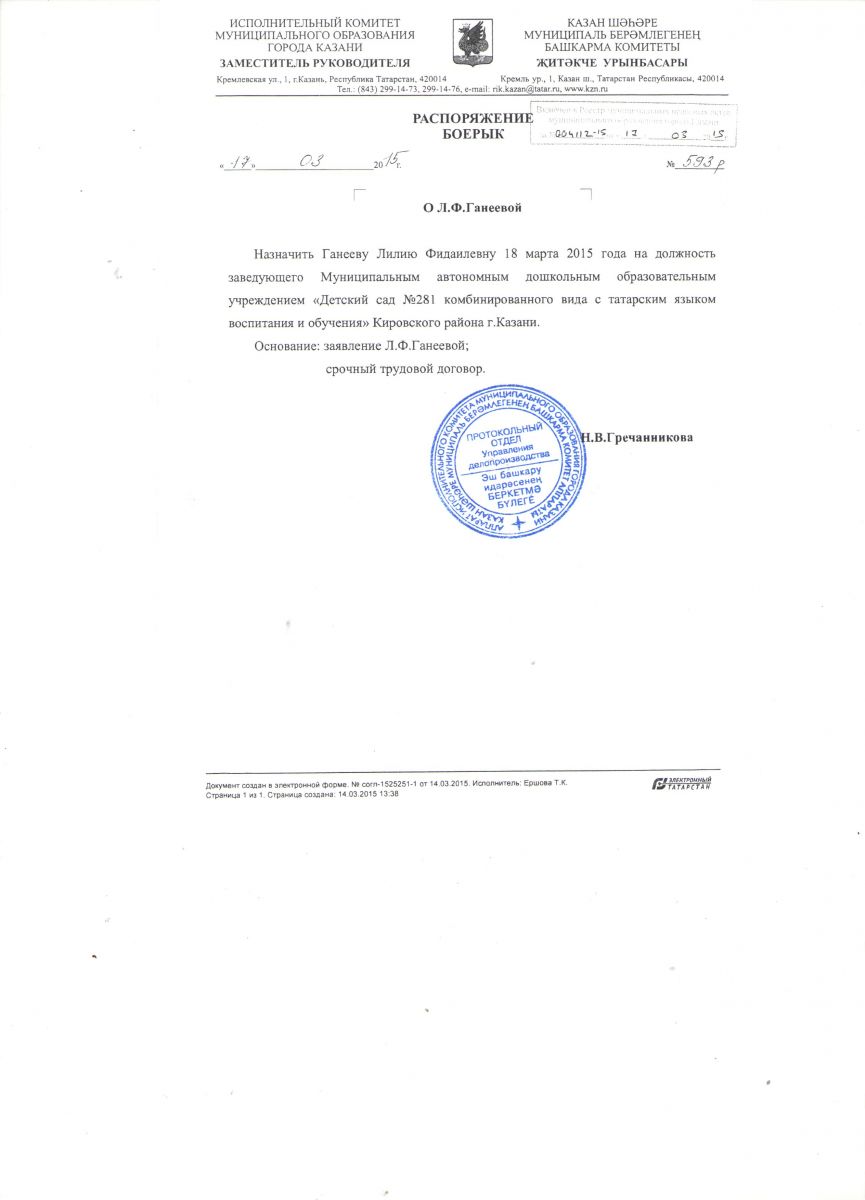 Приказ о назначении заведующей