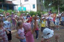 В празднике участвовали воспитанники всех групп. Малыши принимали участие в народных играх и национальных состязаниях: донеси яйцо, бег на лошадях; старшие состязались в том, кто аккуратнее перенесёт вёдра с водой, перетягивании каната, беге в мешках. Дети продемонстрировали свою ловкость, быстроту. Болельщики от души подбадривали участников бурными аплодисментами. Все получили море удовольствия!