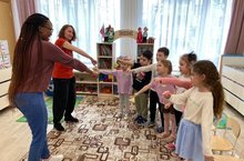 Ежегодно в нашем садике в конце учебного года мы проводим английскую неделю (17-21.04). В рамках этого проекта, на этот раз, было охвачено несколько подвижных игр, таких как, «Кот, кот какая сегодня сметана на обед?», «Кошки мышки», «Большой, плохой волк». В конце английской недели, мы с детьми, которые ходят на кружок «Занимательный английский», показали сказку «Златовласка и три медведя». И в завершении проекта детей ждал сюрприз - снова наша гостья из Африки по имени Ди. Вместе с детьми мы играли в подвижные игры на свежем воздухе и Ди научила наших ребят петь песню про части тела. Всем такое мероприятие пришлось по душе, но больше всего нашим «юным англичанам» понравилась торжественная часть, где им вручали дипломы за участие в спектакле.