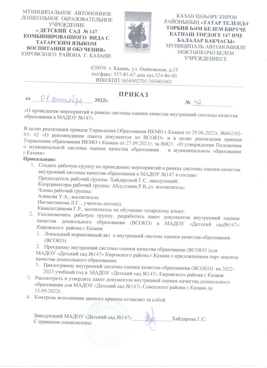 Приказ о проведении мероприятий в рамках ВСОКО в МАДОУ "Детский сад № 147"