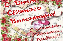 Поздравляем с Днём святого Валентина и желаем, чтобы любовь всегда жила в вашем сердце, чтобы на душе было тепло и радостно, чтобы в жизни всё удавалось, чтобы рядом всегда были родные, близкие люди.