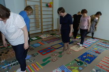 Каждая группа представила свою «Дорожку здоровья». Каждая дорожка была по — своему оригинальна и интересна. Участники использовали множество нетрадиционного оборудования при изготовлении: фломастеры, бусы, губки, бигуди, пуговицы и многое другое. Воспитатели с удовольствием "прогулялись по дорожкам здоровья". -