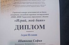 Шатнова София, ученица 5А класса награждается Дипломом Лауреата III степени в городском конкурсе исполнителей на баяне "Играй, мой баян", Поздравляем Софию! И желаем ей дальнейших творческих успехов!