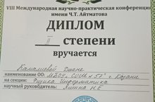 Поздравляем Камалиеву Диану, ученицу 9А класса с Дипломом II степени на VIII Международной научно-практической конференции имени Ч.Т.Айтматова, на секции Физика. Информатика. Руководитель: Яшина Н.Е.