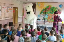 После линейки и зарядки в пришкольный лагерь "Березка" пришел белый мишка. Было организовано Шоу мыльных пузырей. Дти пообщались с медведем, сфотографировались с ним и понаблюдали за мыльными пузырями.